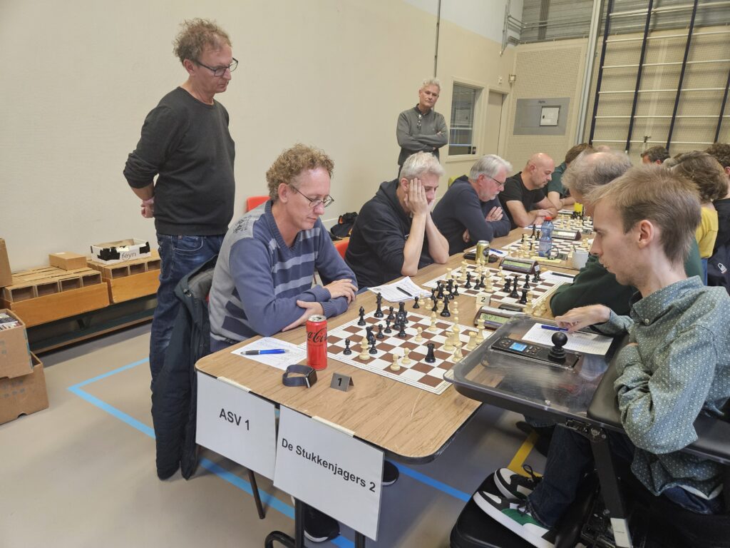 Dat tegenspel van de Sicilianen wist Eelco op het eerste bord wel te creëren op een hele rare manier. Volgens Euwe moet je pas rocheren als je geen beter zet hebt. Nou Eelco interpreteert dat als volgt, je loopt stap voor stap met je koning naar g8 en zet je toren op h7 zodat hij klaar staat voor als de h-lijn geopend wordt….. Waarom de toren trouwens dat illustere plan niet van h8 kan uitvoeren gaat de schaakkennis van deze schrijver te boven, evenals de beweegreden van zijn tegenstander om actief toe te laten dat die lijn ook daadwerkelijk open ging. Hierna bracht Eelco het eerste punt gedecideerd binnen.