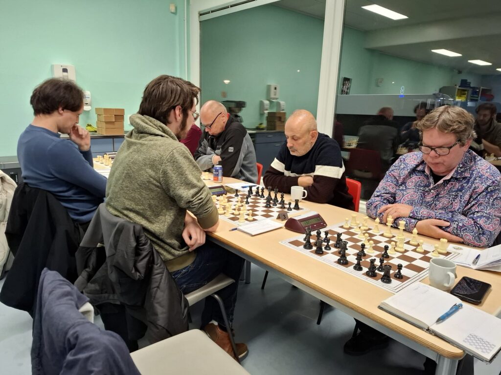 Erik Wille ging de strijd met Emeline Smit niet echt aan. In een fractie betere stelling werd de vrede getekend. Xadya van Bruxvoort en Désiré Fassaert koersten vanuit de opening op remise af. Degene die het initiatief zou nemen, zou waarschijnlijk van de koude kermis thuiskomen. Remise dus. Bij Rik de Lange en Jacques Ottenheijm ontspon zich een strategisch gevecht, waar Rik vertrouwde op zijn loperpaar. Na een afwikkeling restte een remiseeindspel. 1,5-1,5.