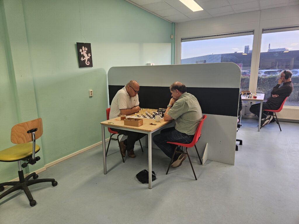Hans Polman leek het betere van het spel te hebben. Ergens raakte hij echter een stuk kwijt, wellicht een iets te overmoedig stukoffer, dat heb ik gemist. Yaron Huberts verzilverde het voordeel eenvoudig. Muhammed Eskif speelde een schitterende partij tegen Arnout Karssenberg. Al snel had Muhammed twee veropgerukte verbonden vrijpionnen op de damevleugel. Arnout had echter tegenspel over de a-lijn en de diagonalen. In een complexe stelling tastte Muhammed mis. Torenverlies was het gevolg. Xadya van Bruxvoort was in tijdnood geraakt en de tegenstander werd actief met zijn torens. Een tussenzetje kostte materiaal en de partij. 5-1 en een monsternederlaag was in de maak. Jacques Boonstra had het moeilijk tegen Nick Zhao die dreigingen had over de open f-lijn. En Ben Gussinklo zag na een speculatief pionoffer zijn aanval gestuit worden. Rein Visee werd gevaarlijk dankzij een ijzersterk loperpaar. In alle rust combineerde de ASA-speler naar mat, maar overzag daarbij een aftrekschaak met dameverlies tot gevolg. Onze invaller scoorde zo het enige winstpunt. Jacques werd intussen langzaam maar zeker naar een nederlaag gespeeld. Tot er een heerlijke schwindle in de stelling kwam. Via een torenoffer zou Nick Zhao mat gaan. Jacques zag het niet en ging zelf mat.